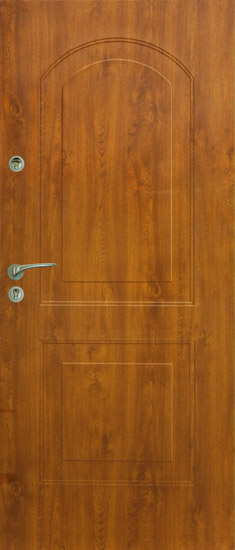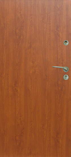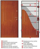 Skrzydło drzwiowe o grubości 45 mm wykonane jest z blachy ocynkowanej laminowanej w strukturze drewna lub lakierowane według palety RAL, wypełnione styropianem oraz wzmocnione specjalnymi kształtownikami.