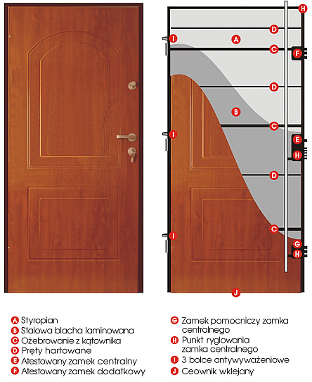 Drzwi standardowo wyposażone sa w trzy zamki, w tym dwa posiadające atest klasy 4 (zamek centralny – dziwięć ruchomych rygli) oraz klasy 5 (zamek górny – trzy rygle). Dodatkowy zamek dolny wyposażony jest w trzy ruchome rygle, rozetę antywłamaniową w klasie 4 ENV, wkładkę dolną atestowaną w klasie C, wkładkę górną z pokrętłem klasy C. Skrzydło posiada trzy bolce antywyważeniowe.