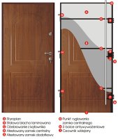 Skrzydło wykonane jest z blachy ocynkowanej laminowanej w fakturze drewna, wypełnieniem jest styropian. Wzmocnienie skrzydła stanowią specjalne kształtowniki. Drzwi standardowo wyposażone są w trzy zamki: zamek główny (pięć ruchomych rygli) posiada certyfikat klasy 5, górny (trzy ruchome rygle) certyfikat klasy 7 i dodatkowy dolny (trzy rychome rygle) certyfikat klasy 7, rozetę antywłamaniową w klasie 4 ENV, wkładkę dolną atestowaną w klasie B, wkładkę górną z pokrętłem klasy B, trzy bolce antywyważeniowe oraz ościeżnicę w kolorze skrzydła.