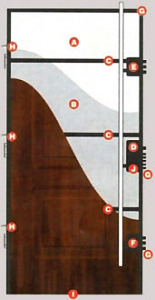 Konstrukcję wewnętrzną drzwi stanowi ożebrowanie wykonane z kątowników i prętów stalowych (zwiększenie odporności na wyważenie).Skrzydło i ościeżnicę wykonano z blachy stalowej, laminowanej okleiną o fakturze drewnopodobnej w naturalnych kolorach. Środek drzwi wypełniono samo gasnącym styropianem.